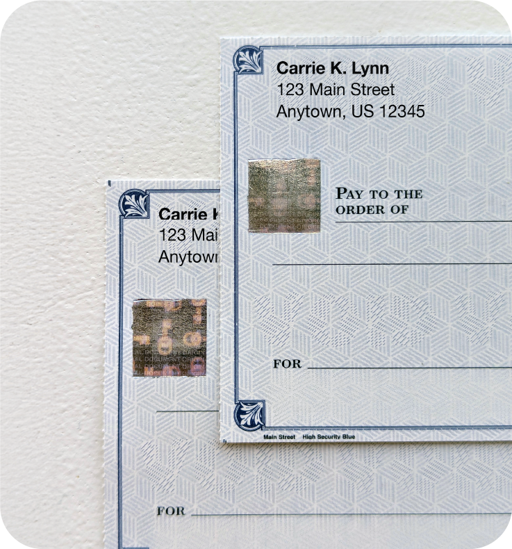 Not everyone has access to a laser engraver – a limitation that high security checks use to their advantage. 3D hologram foils are permanently applied to the fronts of checks, presenting a purely unique image that changes colors and angles along with our perspectives.